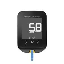 Use with FreeStyle Optium meter for blood glucose monitoring. Put drop of blood sample on the tip of the strip to get the reading on the meter