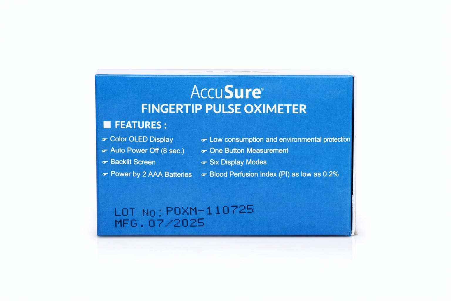 The AccuSure Fingertip Pulse Oximeter is a reliable and easy-to-use device designed to measure blood oxygen saturation (SpO₂) and pulse rate instantly. With its compact and lightweight design, it is perfect for use at home, clinics, and on the go.
