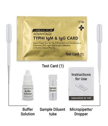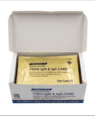 The ADVANTAGE Typhi IgM & IgG Rapid Test Card is a diagnostic kit designed for the detection of antibodies (IgM & IgG) against Salmonella typhi in human blood, serum, or plasma. It is widely used for the screening and diagnosis of Typhoid fever. This rapid test helps differentiate between recent (IgM) and past or ongoing (IgG) infections, making it a valuable tool for timely medical decisions.