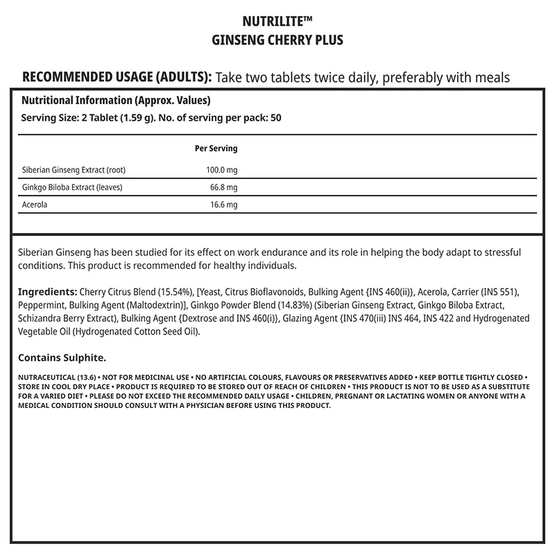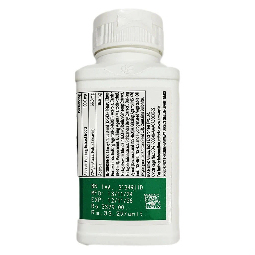 Amway nutrilite ginseng cherry plus there has been extensive research on siberian ginseng and ginkgo biloba. Siberian ginseng has been studied for its effect on work endurance. This amway nutrilite ginseng cherry plus also contains acerola and citrus bioflavonoid concentrates.