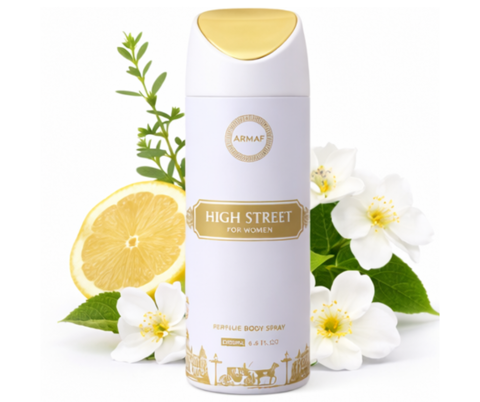 Armaf High Street Deodorant for Women A fragrance of subtle blooms, with entrancing notes of fresh citrus, Magnolia, Honeysuckle and a sweet tangy Raspberry accord ending with a base of Cashmere wood, Amber and Musk.