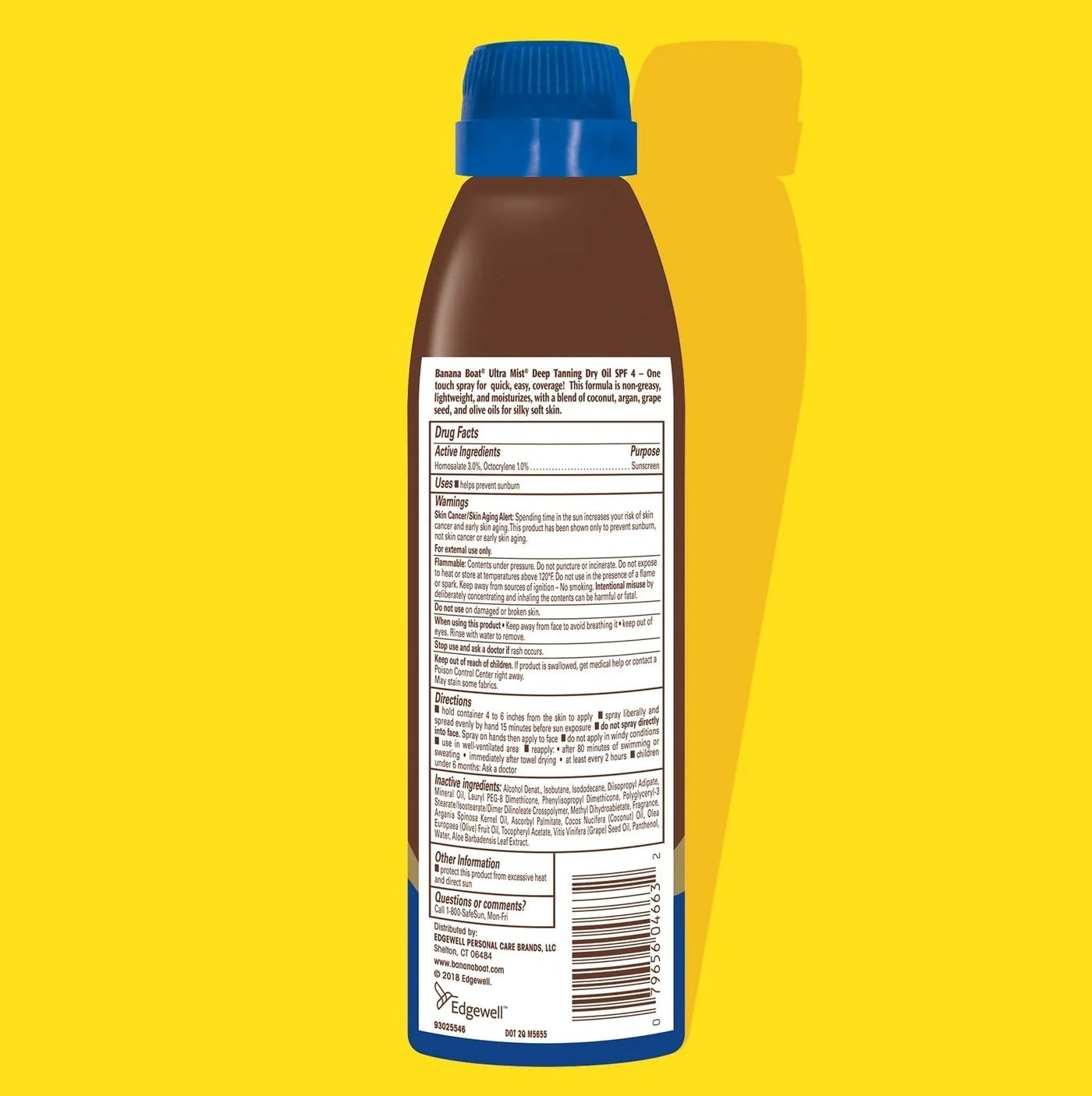 Banana Boat Protective Dry Oil Clear Sunscreen Spray 25 170gm enjoy a sun kissed glow with banana boat deep tanning dry oil clear spray sunscreen with spf 15. this lightweight, non-greasy dry oil tanning spray formula is made with natural argan oil and will leave your skin feeling silky-smooth. banana boat tanning oil with spf is water-resistant for up to 80 minutes and features a cap-free twist and lock design and ultramist technology for quick and easy coveragefree formulated tanning oil spray made without oxybenzone and octinoxatewater resistant for up to 80 minutesnon-greasy and lightweight feelimproved formulated dry sunscreen spray made with argan oil is formulated to provide safe and effective broad-spectrum uva/uvb protection, without feeling heavy or greasy on the skin. this fast absorbing formula rubs in clear and is ultra-breathable, so it feels as if it is barely on, while still providing protection from the sun so you can have fun no matter where you are