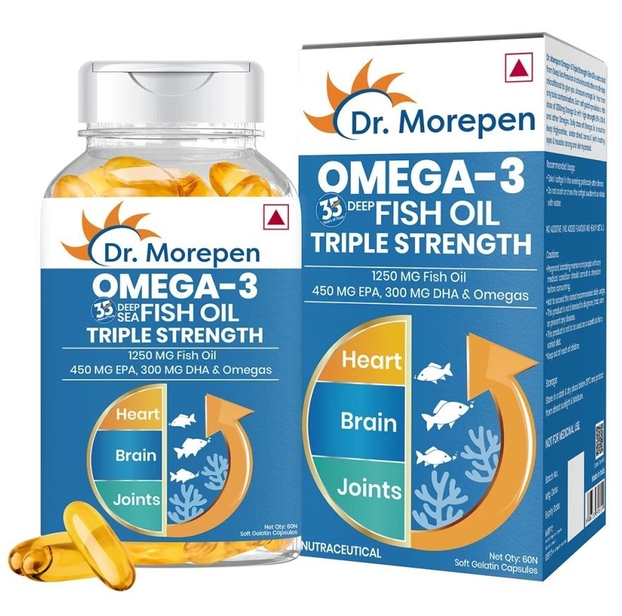 Dr. Morepen Fish Oil 1250mg with DHA & EPA (900mg) delivers premium quality fish oil sourced from cold-water Peruvian Anchovy. Processed through molecular distillation, it eliminates heavy metals like mercury and contains no cholesterol, preservatives, or gluten. Using advanced extraction technology, this supplement provides a high concentration of Omega-3 fatty acids, including 550mg of EPA and 350mg of DHA, offering numerous health benefits.