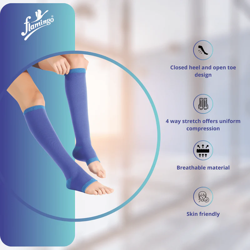 Flamingo Premium Below Knee Stockings provide controlled compression to the legs to squeeze away abnormal back flow of blood into the superficial veins that lie just beneath the surface of the skin from the perforating veins. It is used in all forms of venous disease including blood pools or congests in legs.