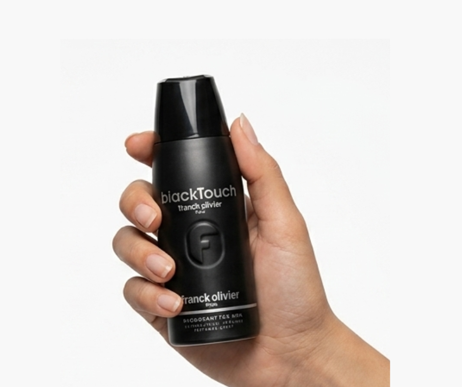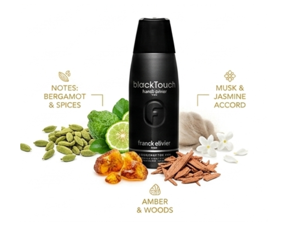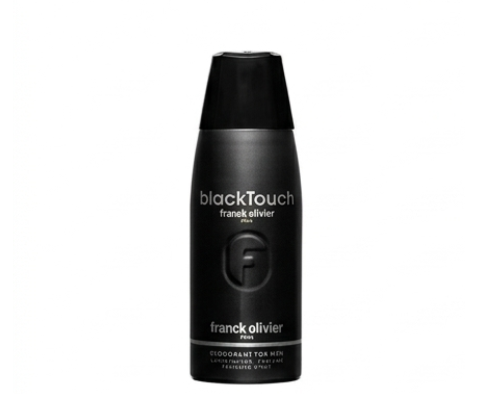 Franck Olivier Black Touch Deodorant Spray for Men Black Touch Deodorant This masculine fragrance starts with a fresh start around grapefruit, which continues along with a subtle spice note. This duo of grapefruit and spices gives way to a base of geranium, jasmine, and magnolia.