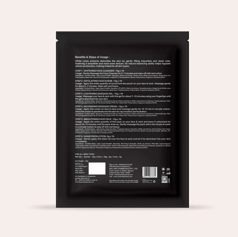 | Varients | De-Tan Sun Protection Facial Kit (AHA & Enzymes), Red Wine Tightening & Skin Repair Facial Kit, Water Lily Skin Whitening & Brightening Facial Kit, Pure White Whitening Vitamin-C Facial Kit, Hydra Boost Facial Kit (Intense Hydration & Nourishment) |