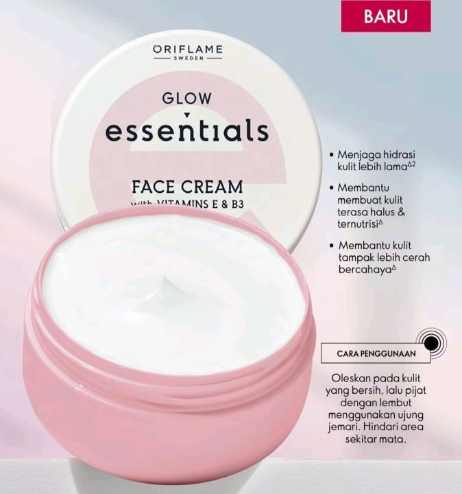 Oriflame Glow Essentials Face Cream with Vitamins E & B3 75gm that has your hydration needs covered day and night. Designed to moisturize, protect and enhance glow, it helps to boost skin hydration instantly and maintains moisture for up to 24 hours, leaving your skin feeling soft and smooth with texture visibly improved. Features a paraben-free, non-GMO, dermatologically tested formula featuring Vitamin B3 active, with Vitamin E. Light, non-greasy texture with a delicate floral scent. All skin types.