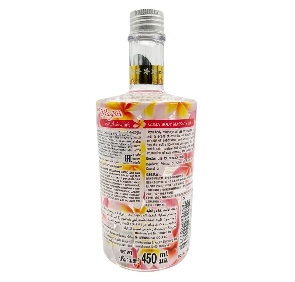 Aroma body massage oil use for massage and relax by scent of essential oil. Coconut oil is enriched of antioxidant and vitamin E which keep skin soft smooth and anti aging. Olive oil maintain skin moisture and elasticity, also reduce accumulation of skin dirtiness and brighten skin.