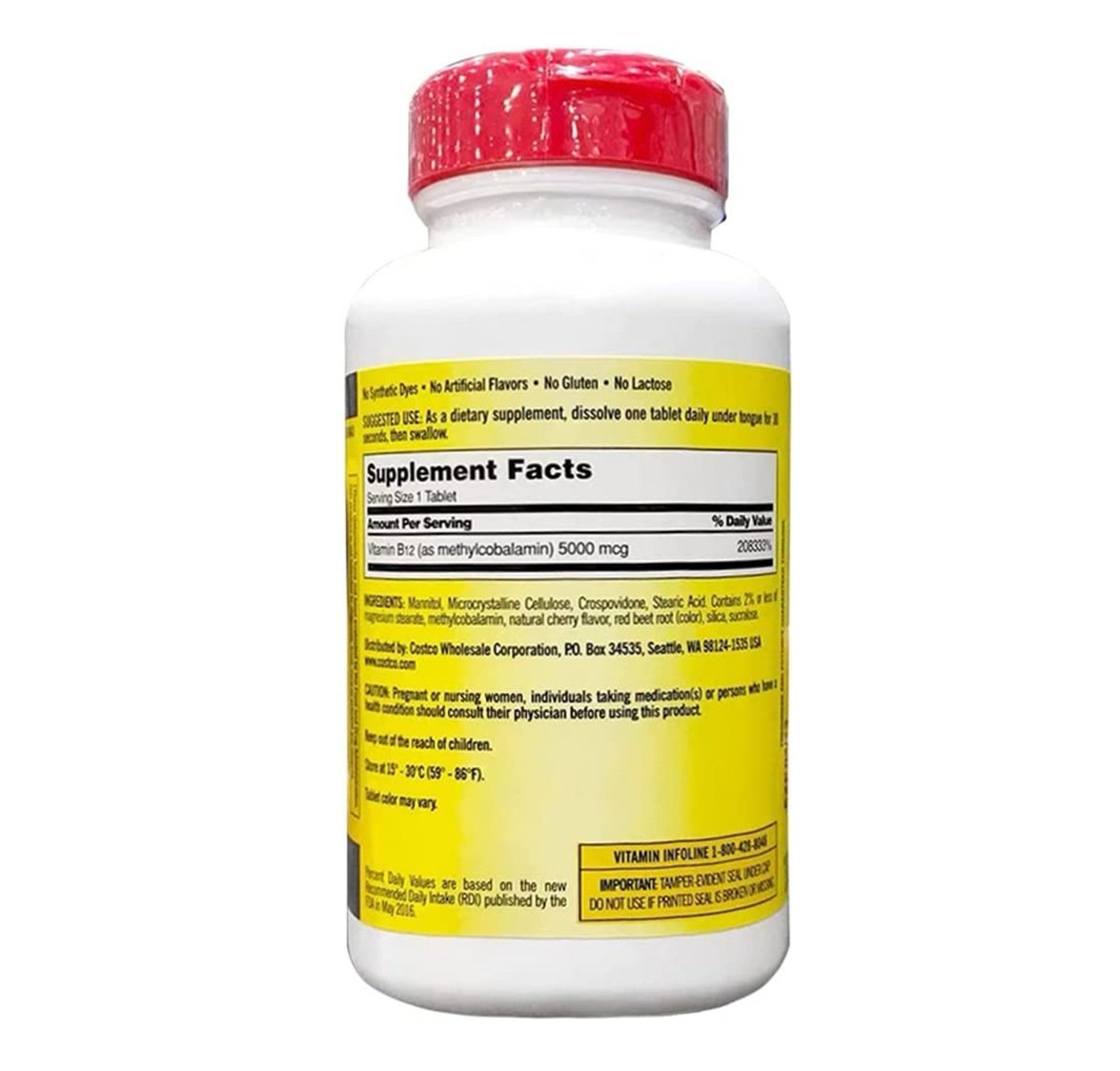 Kirkland Signature B12 5000 mcg Methylcobalamin 300 Tablets provides a potent dose of vitamin B12, essential for energy production, healthy metabolism, and red blood cell formation. With a delicious cherry flavor, this supplement supports overall well-being and helps maintain healthy nerve function. Each tablet delivers a high dose of vitamin B12, making it ideal for those with a deficiency or those seeking to boost their vitamin B12 intake.