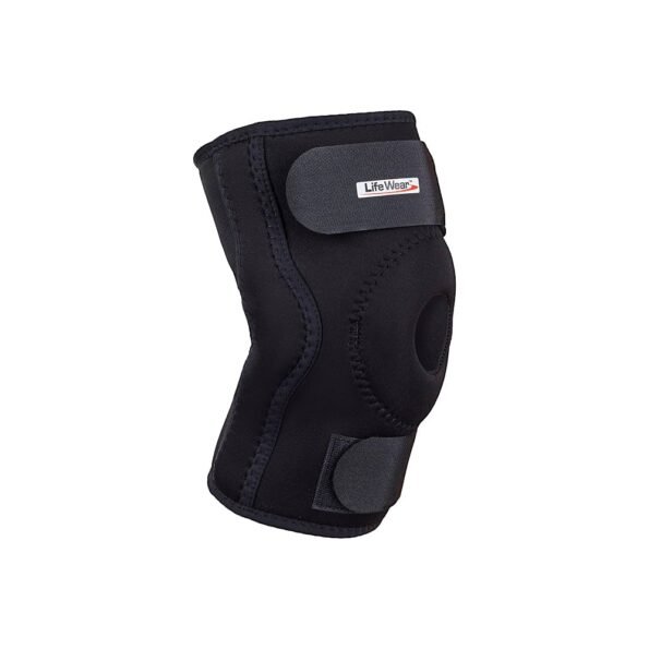 The LifeWear Hinged Knee Wrap (also called Hinged Knee Brace Neoprene in LifeWear’s catalog) is a knee support device with side hinges (bi-axial) that provides mechanical support to the knee joint. It is designed to stabilize the knee during movement, particularly in cases of mild to moderate ligament strain, post-operative recovery, or when extra support is needed for the medial/lateral (side) structures of the knee.