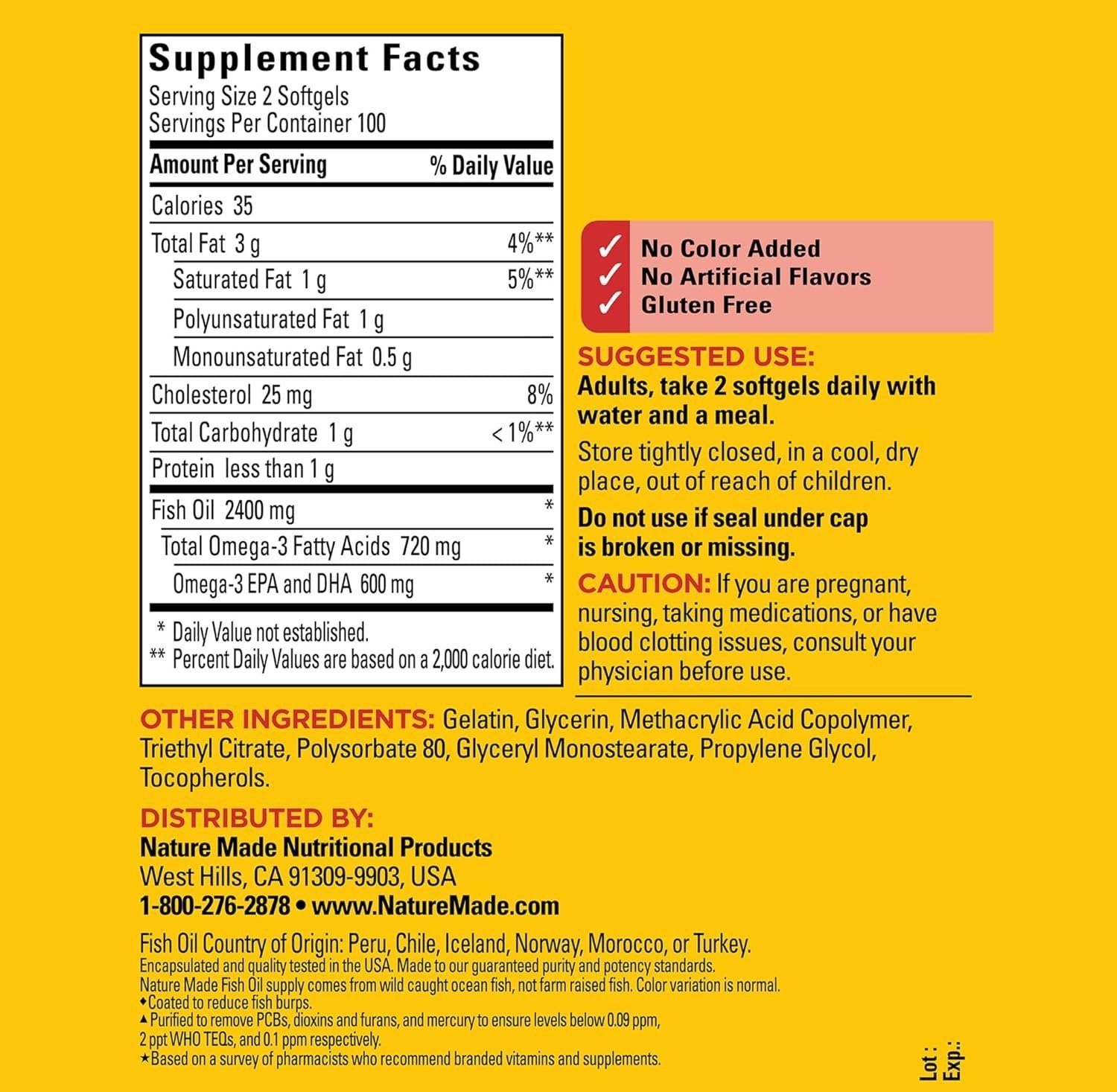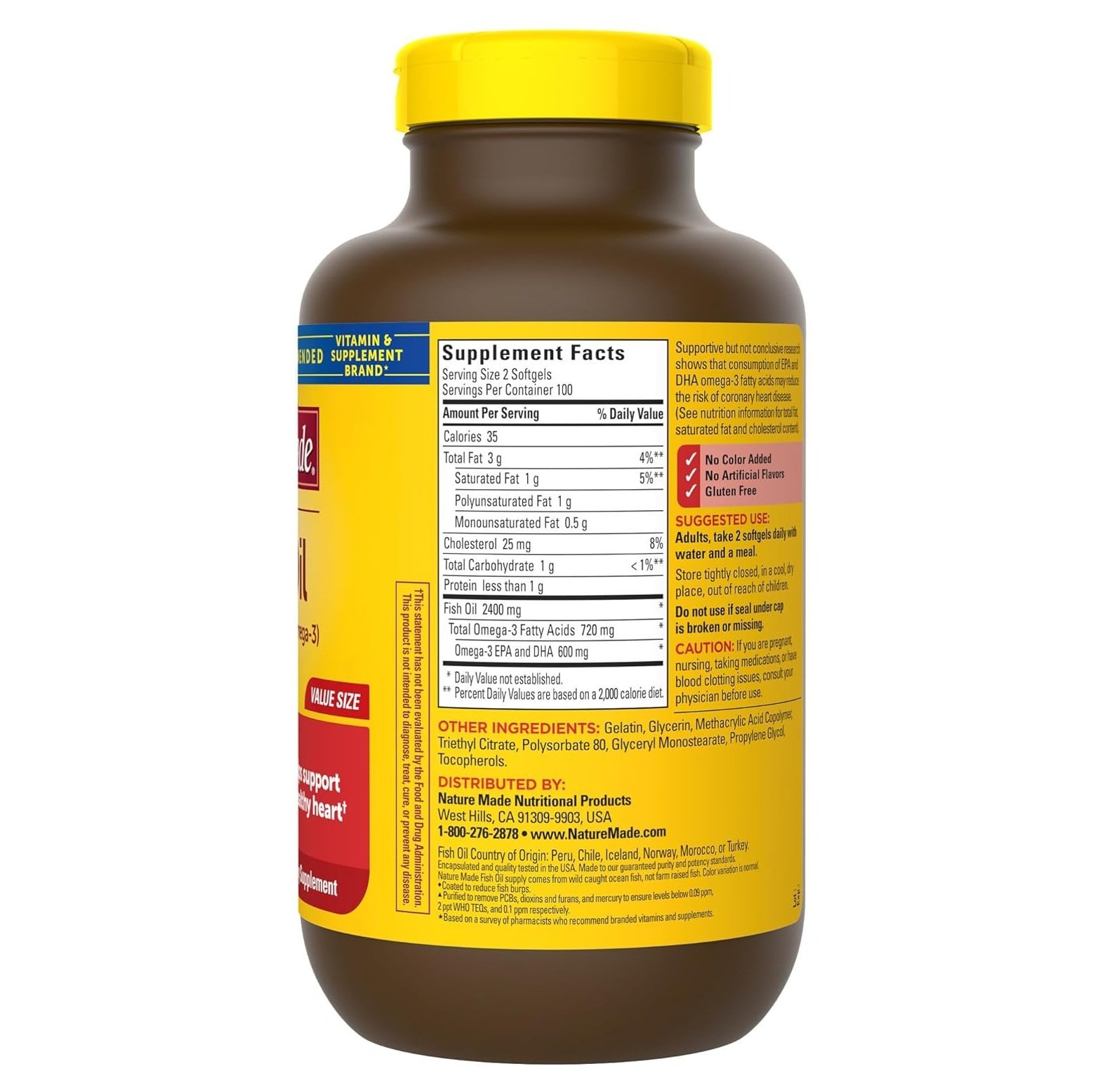 Product Details: Nature Made Fish Oil 1200 mg 200 Softgels supports cardiovascular health with omega-3 fatty acids, EPA (eicosapentaenoic acid) and DHA (docosahexaenoic acid). Research suggests that these omega-3s may reduce the risk of coronary heart disease. This supplement is purified to remove mercury and helps maintain healthy triglyceride levels.