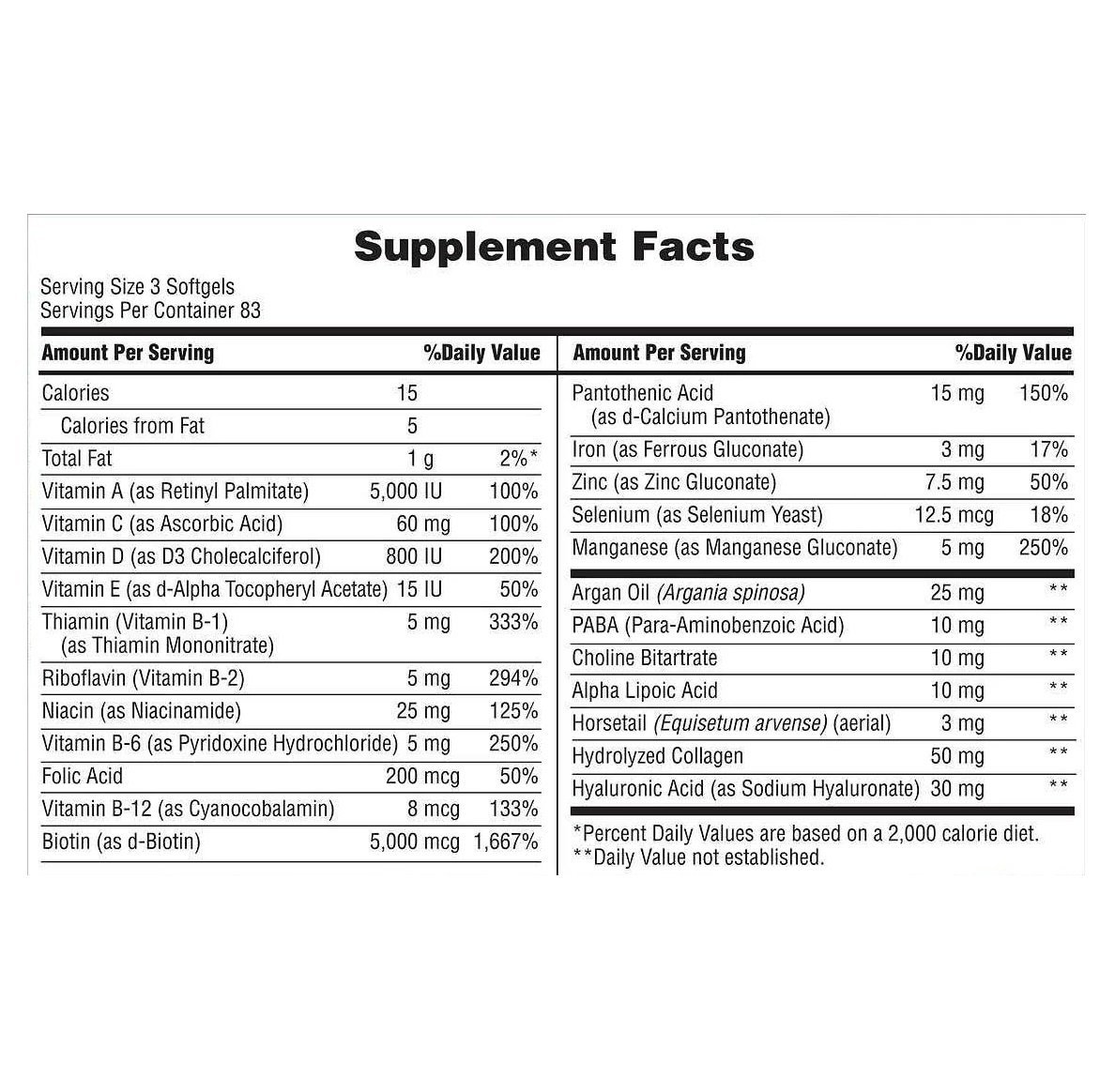 Nature’s Bounty Hair, Skin and Nails 250 Softgels Optimal Solutions Hair, Skin & Nails formula contains just the right balance of nutrients to help support lustrous hair, healthy nails and vibrant skin. This innovative formula provides B vitamins, antioxidant vitamins C & E, vitamin A, hyaluronic acid and more. Because being healthy is always beautiful.