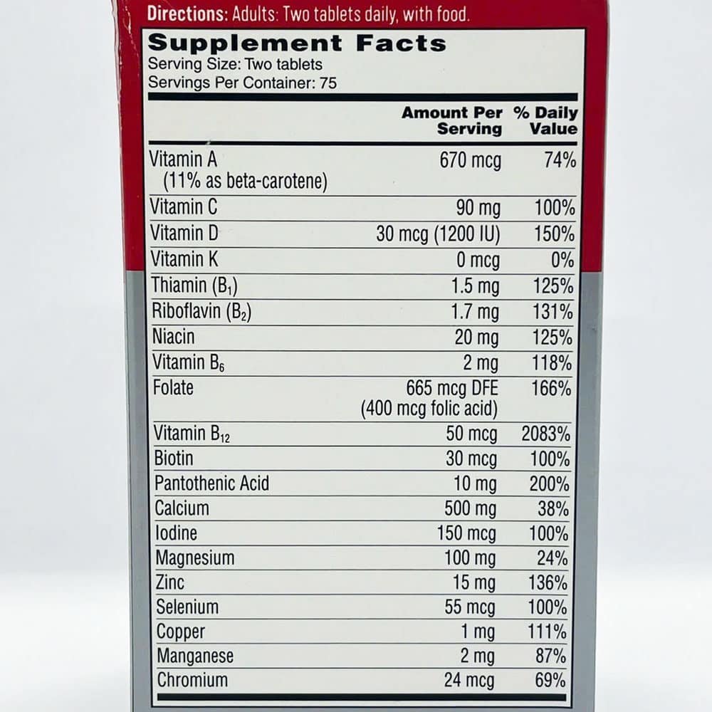 This daily multivitamin contains essential nutrients such as Vitamins A, B6, B12, C and D, Riboflavin, Thiamin, Niacin, Folic Acid, Biotin, Pantothenic Acid, Iodine, Magnesium, Selenium, Copper, Chromium, Calcium, Zinc and Manganese.