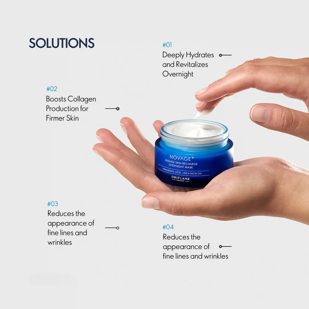 Oriflame Novage+ Intense Skin Recharge Overnight Mask 50 ml an anti-ageing night mask that delivers intense nourishment and next-level hydration to recharge skin. It’s like 8hrs beauty sleep, for more youthful-looking skin. Intensively reduces signs of fatigue. Visibly firmer skin & reduced fine lines after 2 weeks use.