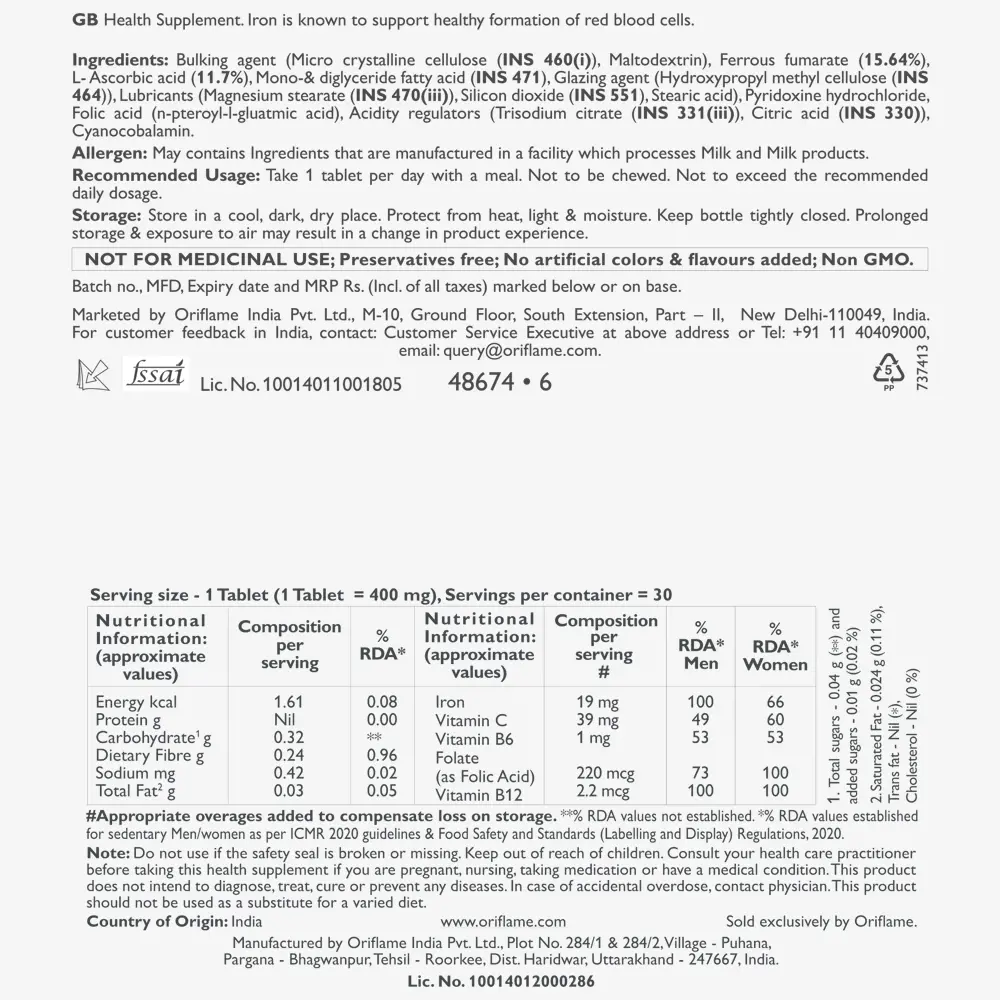 Oriflame Wellosophy Iron Complex 30 Tab (Pack Of 2) a perfect way to top up on those essential vitamins and minerals to secure an adequate intake of micronutrients every day! This multivitamin tablet provides 22 vitamins and minerals essential for health – precision-formulated to support a balanced diet and help meet adult nutritional needs.