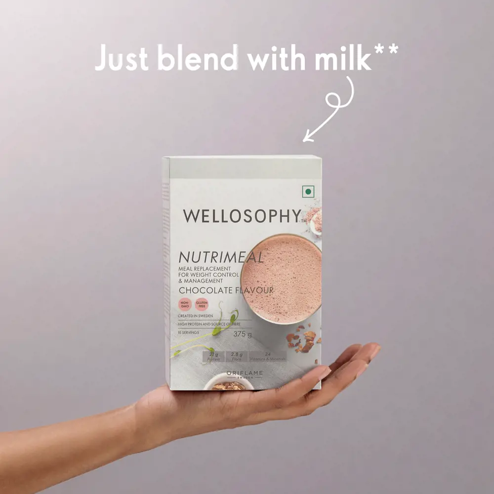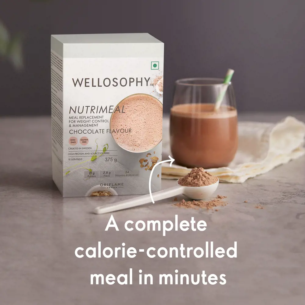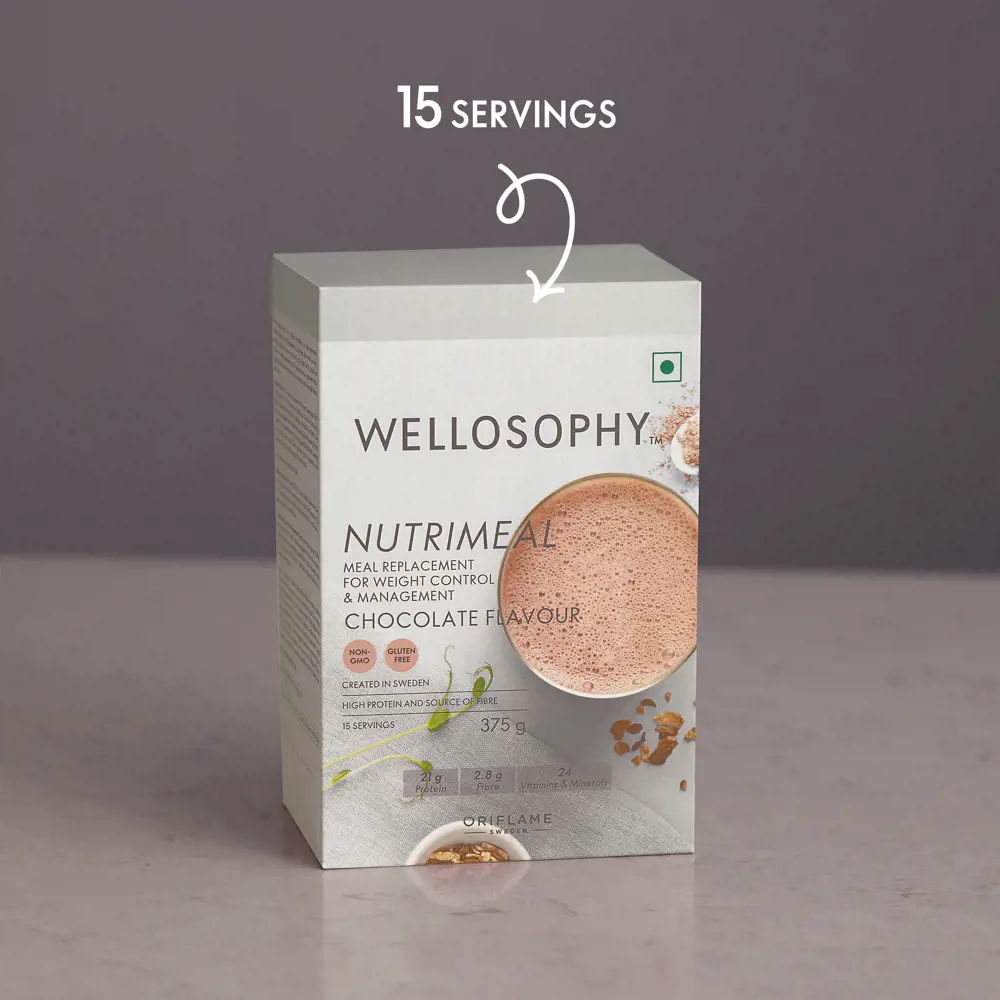 Oriflame Wellosophy Nutrimeal Chocolate Flavour 375 gm is a tasty, safe, and convenient alternative to diets to help with weight control and management. The formula was created by our nutritionists to help you control your calorie intake without missing out on any of the nutrition your body needs.