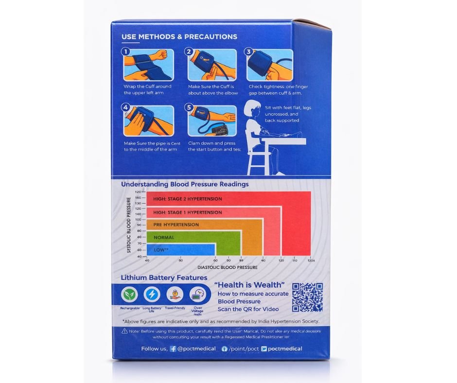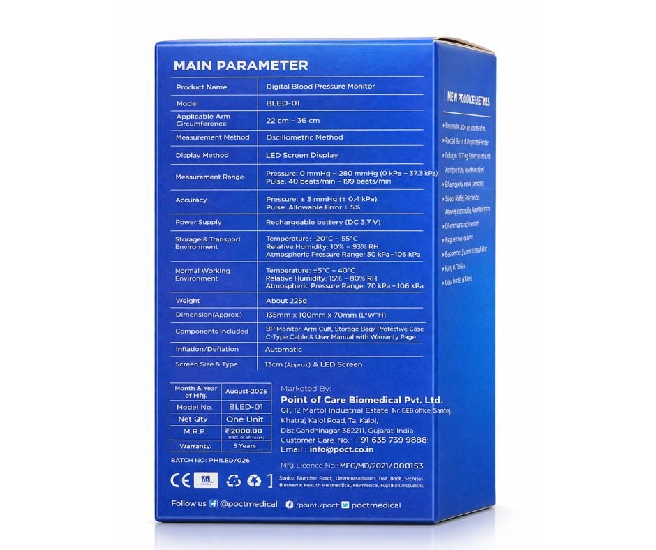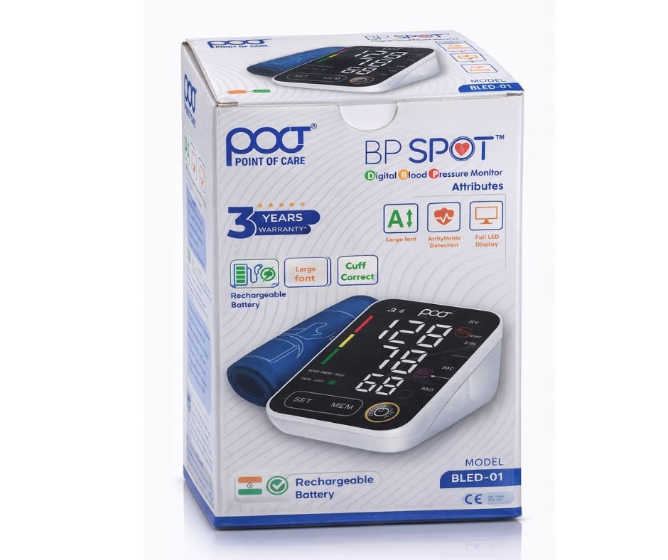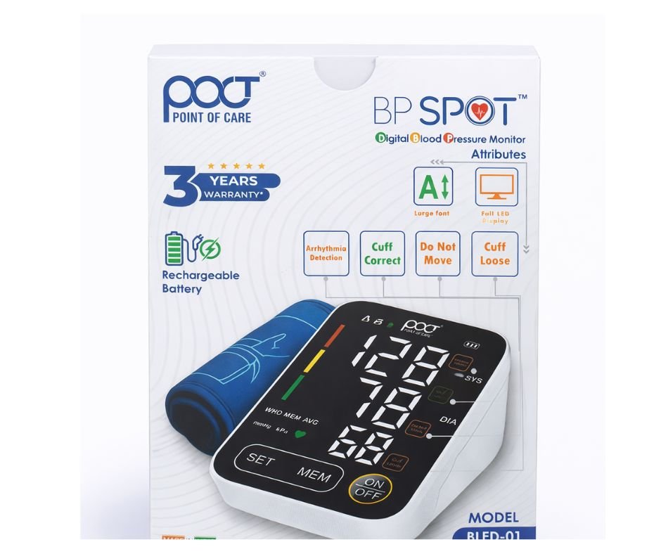 The POCT BLED-01 BP Spot Monitor is a compact and reliable device designed for quick blood pressure and pulse rate measurement in clinical and point-of-care settings. Ideal for hospitals, clinics, pharmacies, and home healthcare environments.