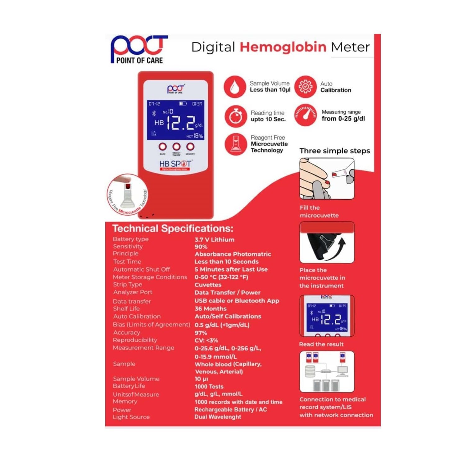 Poct New Digital Hemoglobin Meter Poc-30 a Portable Point of care in vitro diagnostic instrument intended to measure the concentration of total hemoglobin in human blood.