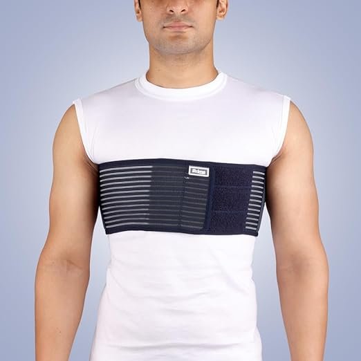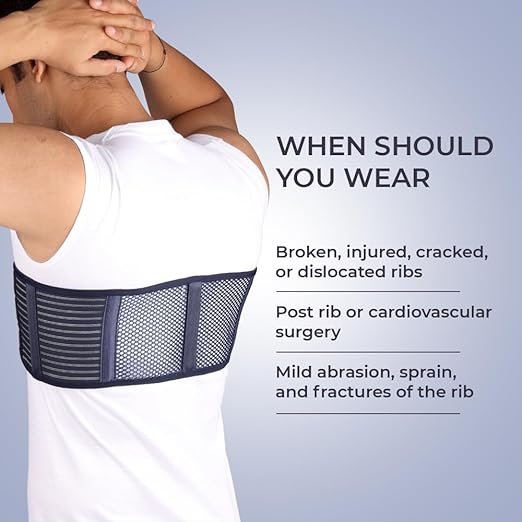 - Wrap the rib belt around your waist so the 5″ wide section covers the mid-torso or rib area.