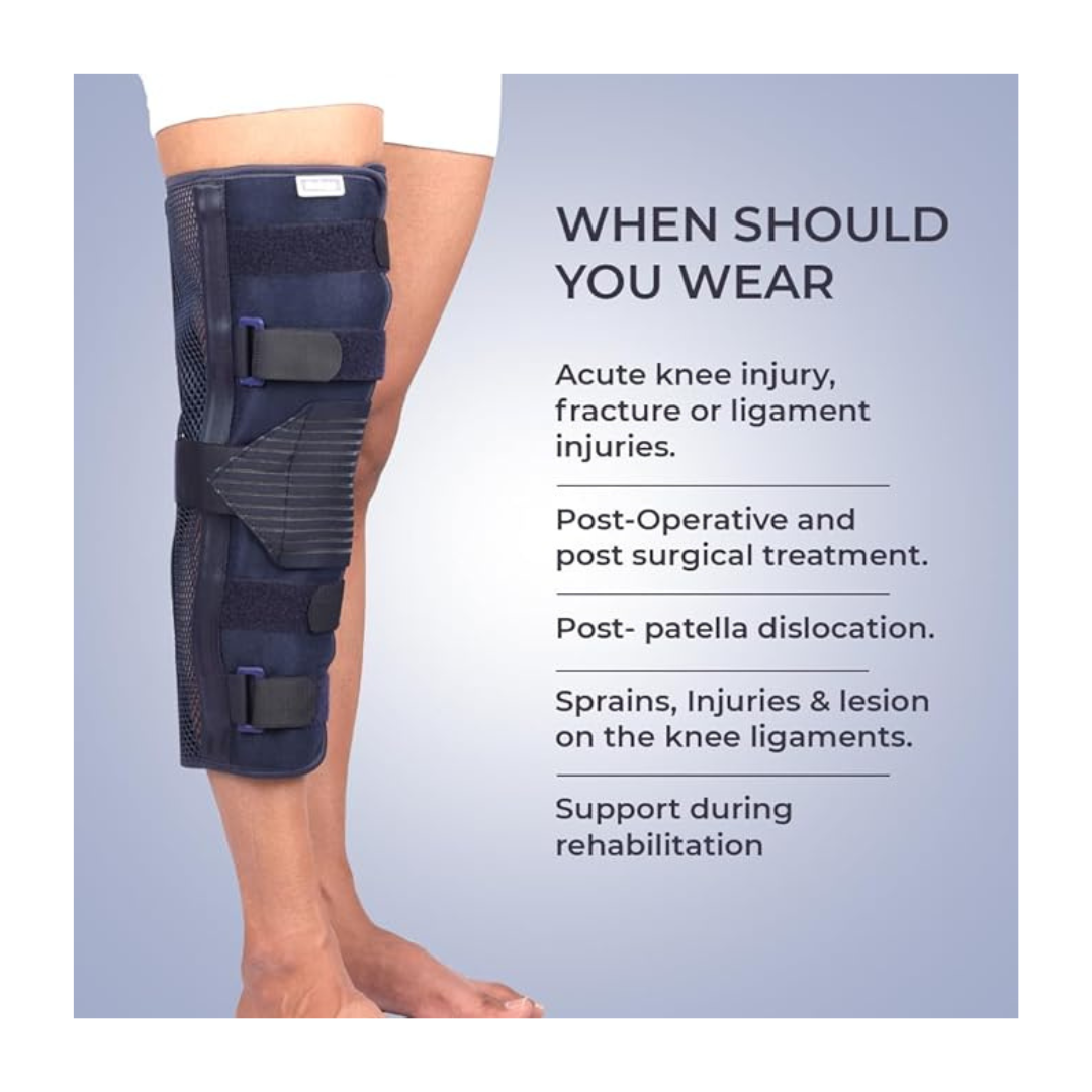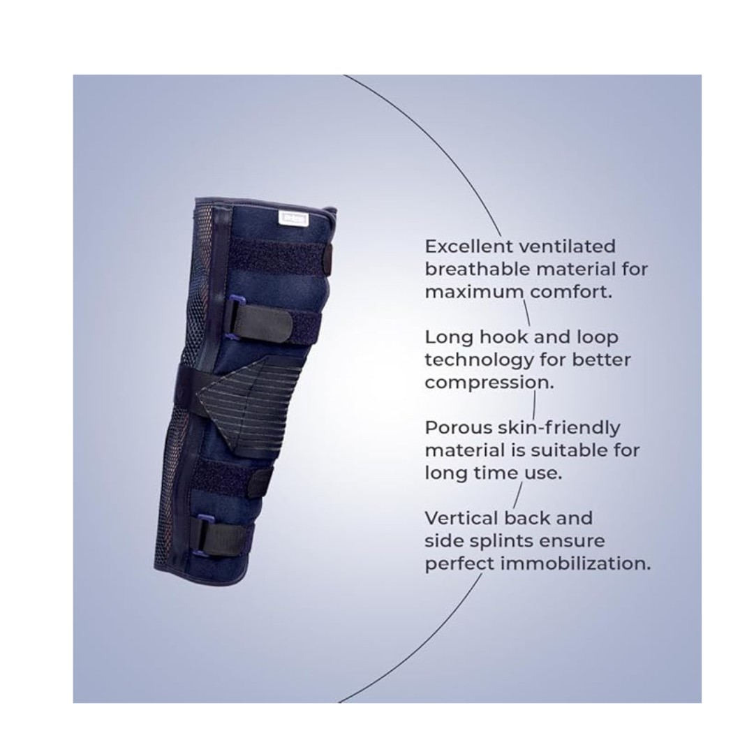 The Prime Knee Immobilizer 18″ is a brace meant to fully immobilize the knee in extension (straight position). It is used after trauma, surgery, fractures, ligament repairs, or significant soft tissue injuries where the knee must be kept stable and motion restricted during healing. The “14” in the name likely refers to the length of the immobilizer (14 inches) — i.e. how far above / below the knee the brace extends.