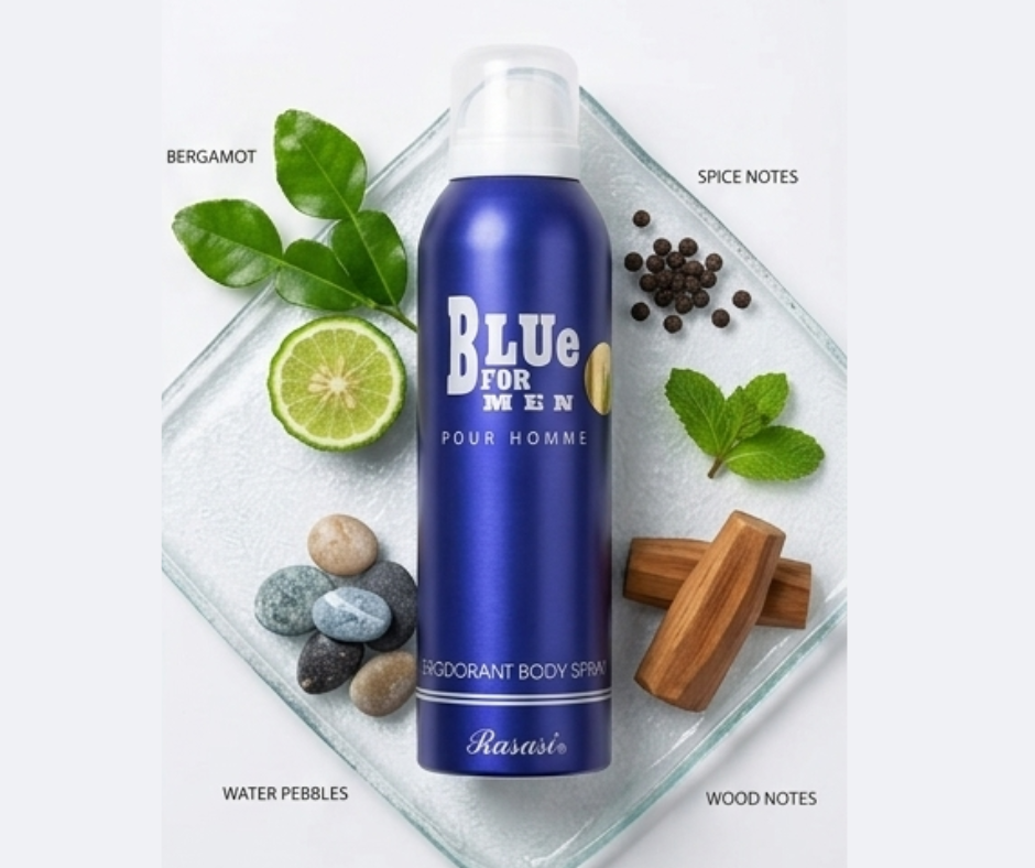 Rasasi Blue Pour Femme Deodorant For Men 200ml the rich composition open with fresh sparkling aromatic and citrus accords of mint and mandarine. The aromatic theme continues into the heart of the fragrance with coriander, floral notes of rose and jasmine are present and these mingle with geranium and pepper. the warm and retentive dry down notes of precious woods and amber adds to the originality and luxuriousness of this unique fragrance.