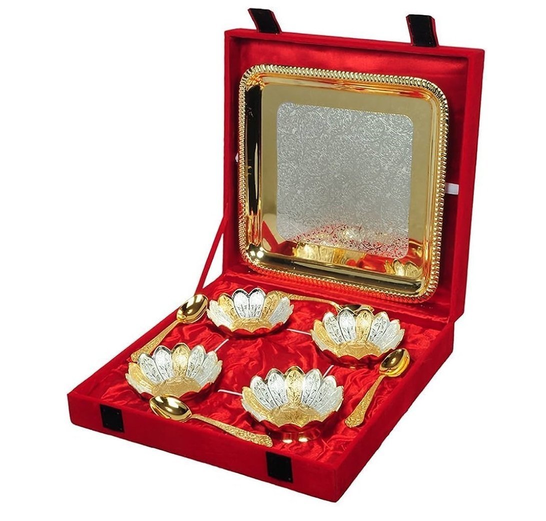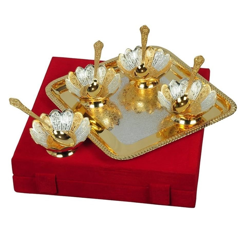 Silver And Gold Plated Floral Shaped Brass Bowl 9 Pcs Set
