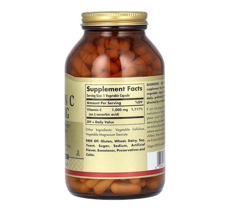 Solgar Vitamin C 1000mg is a water soluble vitamin that helps fight free radicals. Free radicals can cause oxidative stress which may lead to the premature aging of cells. One of its primary functions is collagen formation, which is important for healthy skin and joints. Vitamin C also plays an essential role in the functioning of white blood cells, which are vital components of the immune system.