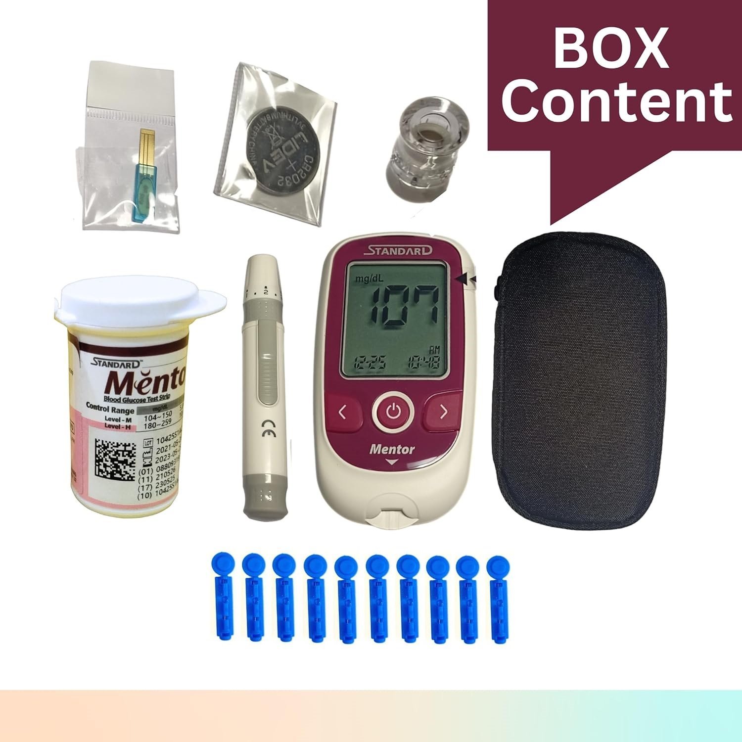 • Glucometer Device, Lancets, Lancing Device, Test Strips, Batteries, Carry Case.