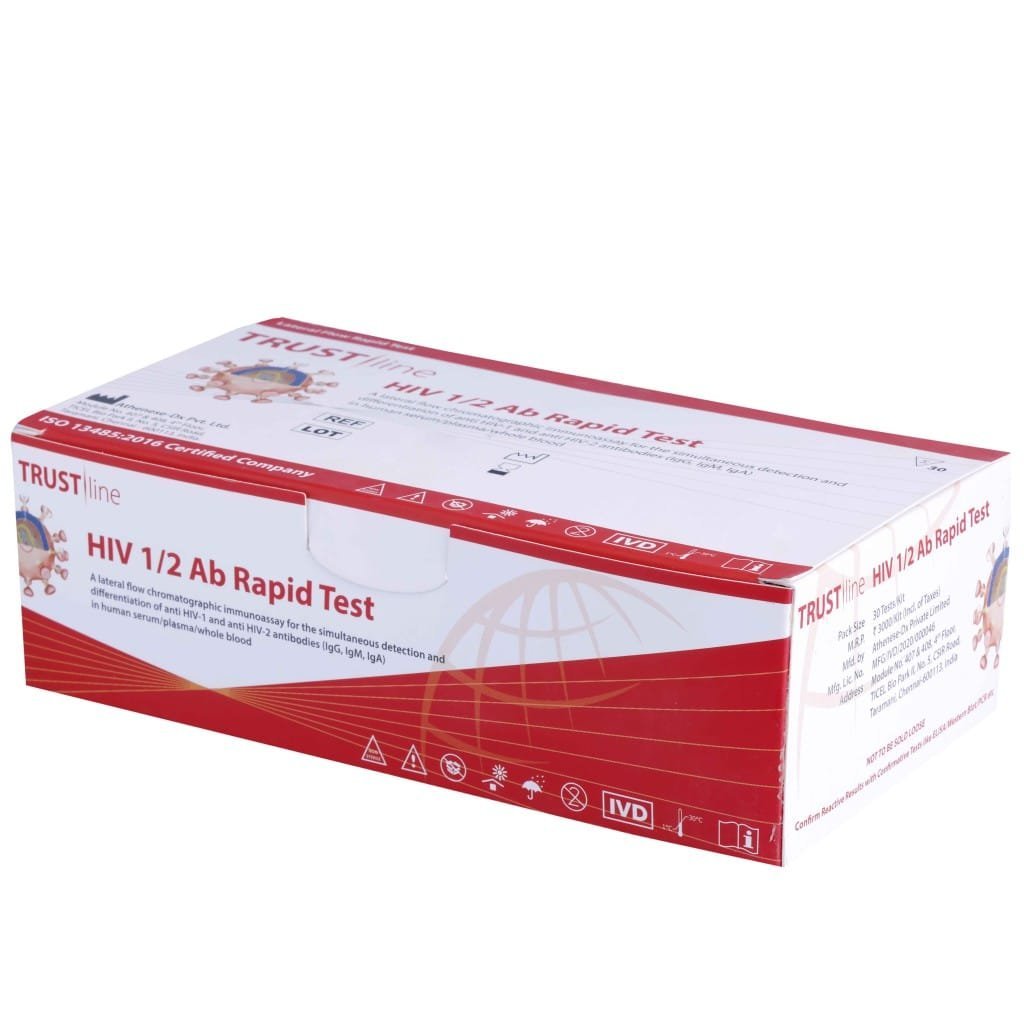 Trust Line HIV 1/2 Ab Rapid 30 Test is an antibody test for screening blood bank supplies and monitoring HIV prevalence. This product features: A lateral flow immunoassay for the simultaneous detection and differentiation of HIV-1 and HIV-2 antibodies (IgG, IgM, IgA) in human serum, plasma or whole blood.