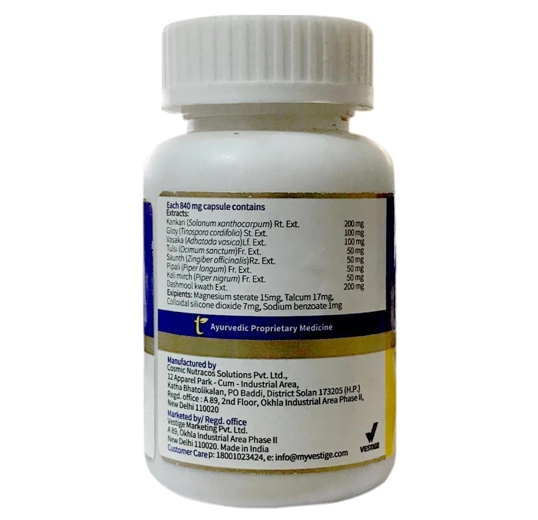 Vestige Ayusante Respocare 60 Veg Capsules this is a combination of powerful ingredients which have anti-inflammatory and bronchodilatory effect. In case with respiratory tract infection with mucus, the synergistic combination of herbs will liquefy the mucus and help in expelling it out.