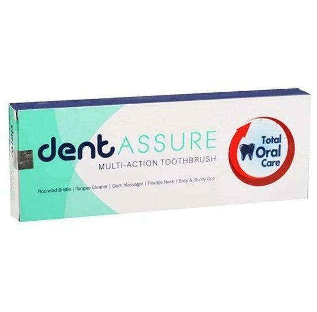 The new Dentassure Multi-Action Toothbrush with 100 % DuPont bristles provides superior all round cleaning of the entire mouth. It has rounded bristles with extended tip for cleaning hard to reach places, a moulded tongue cleaner to help freshen up the breath and a gentle gum massager. It sturdy grip and flexible neck allows easy navigation that helps to clean the mouth completely.