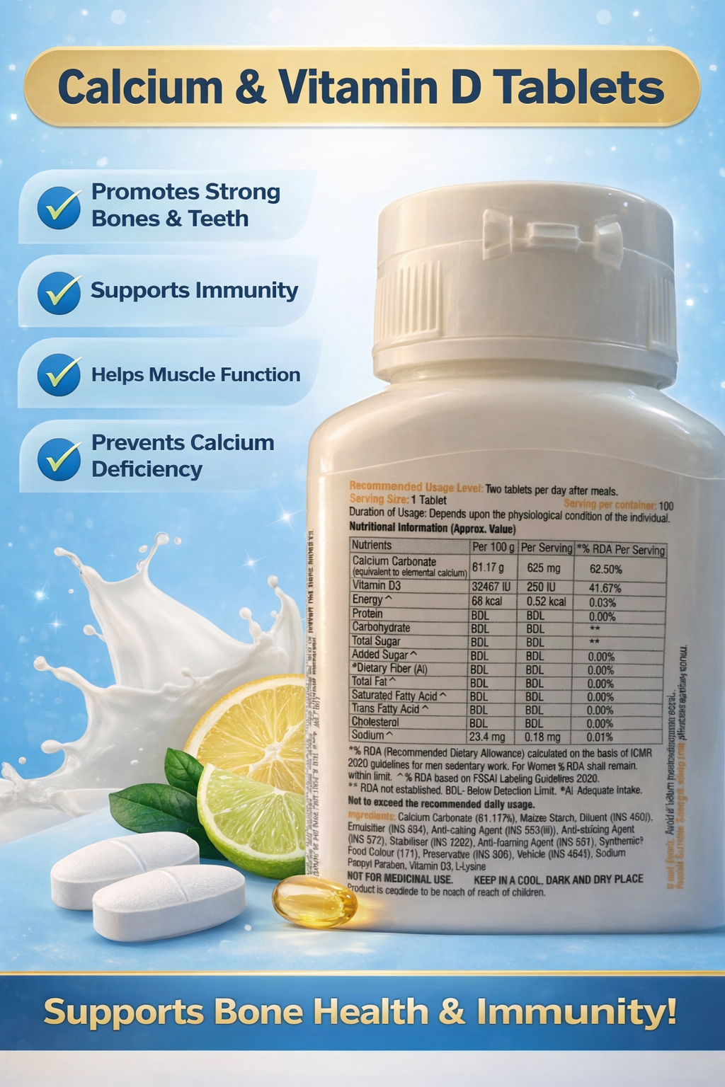 - Enhances bone density with Vitamin D3.