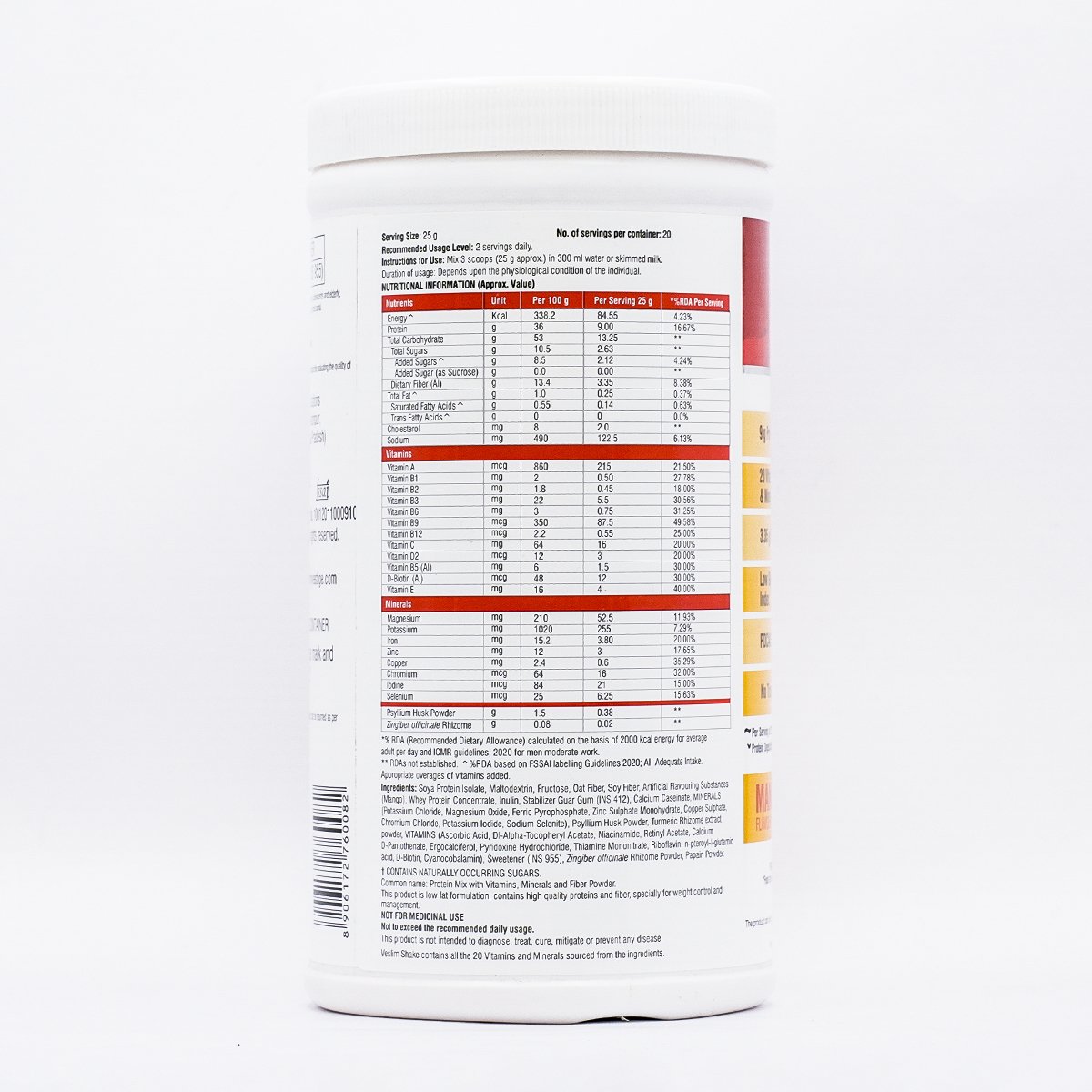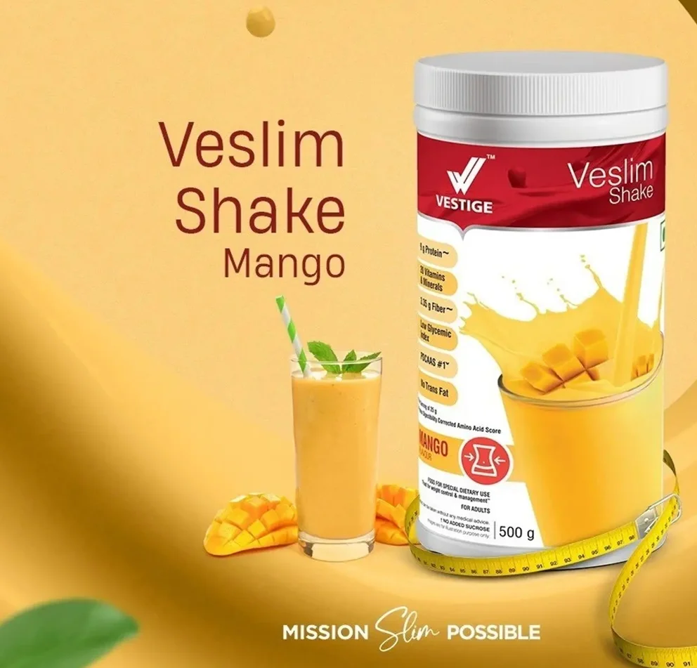 Vestige Veslim Shake Mango (500gm) is a delicious mango-flavoured low-calorie meal that provides complete nutrition without overloading you with unnecessary fats and calories. Each serving of Veslim Shake provides 22 vitamins and minerals, 9. 78 g of protein and 4 g of fibre. Veslim Shake is an ideal drink for the people trying to lose or maintain their weight in a convenient and healthy way.