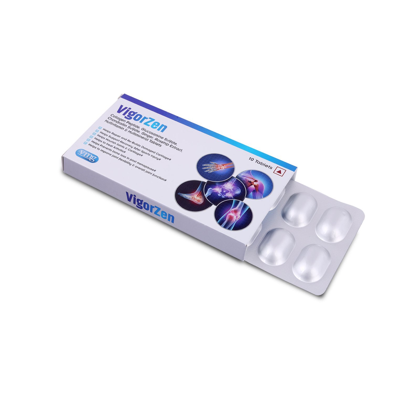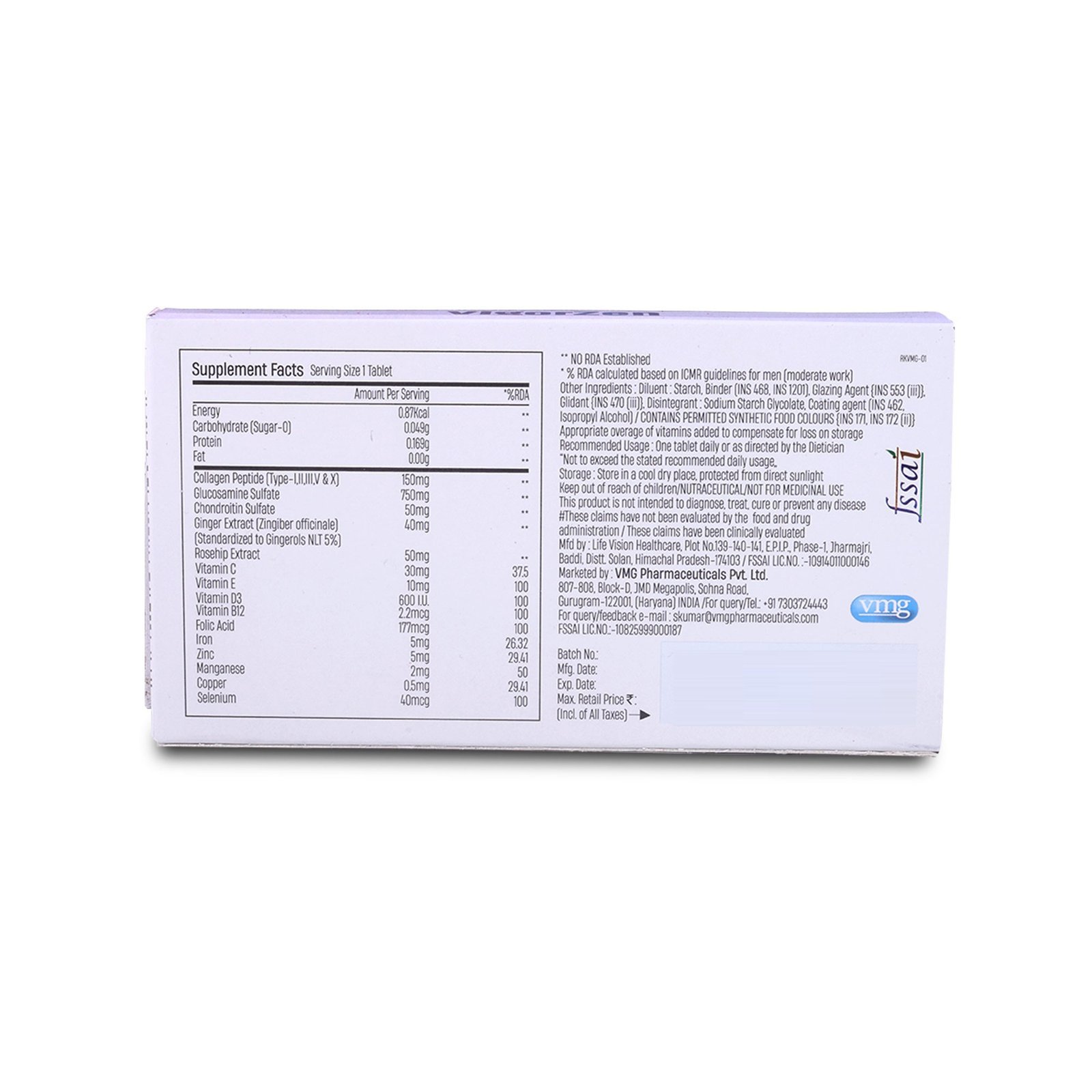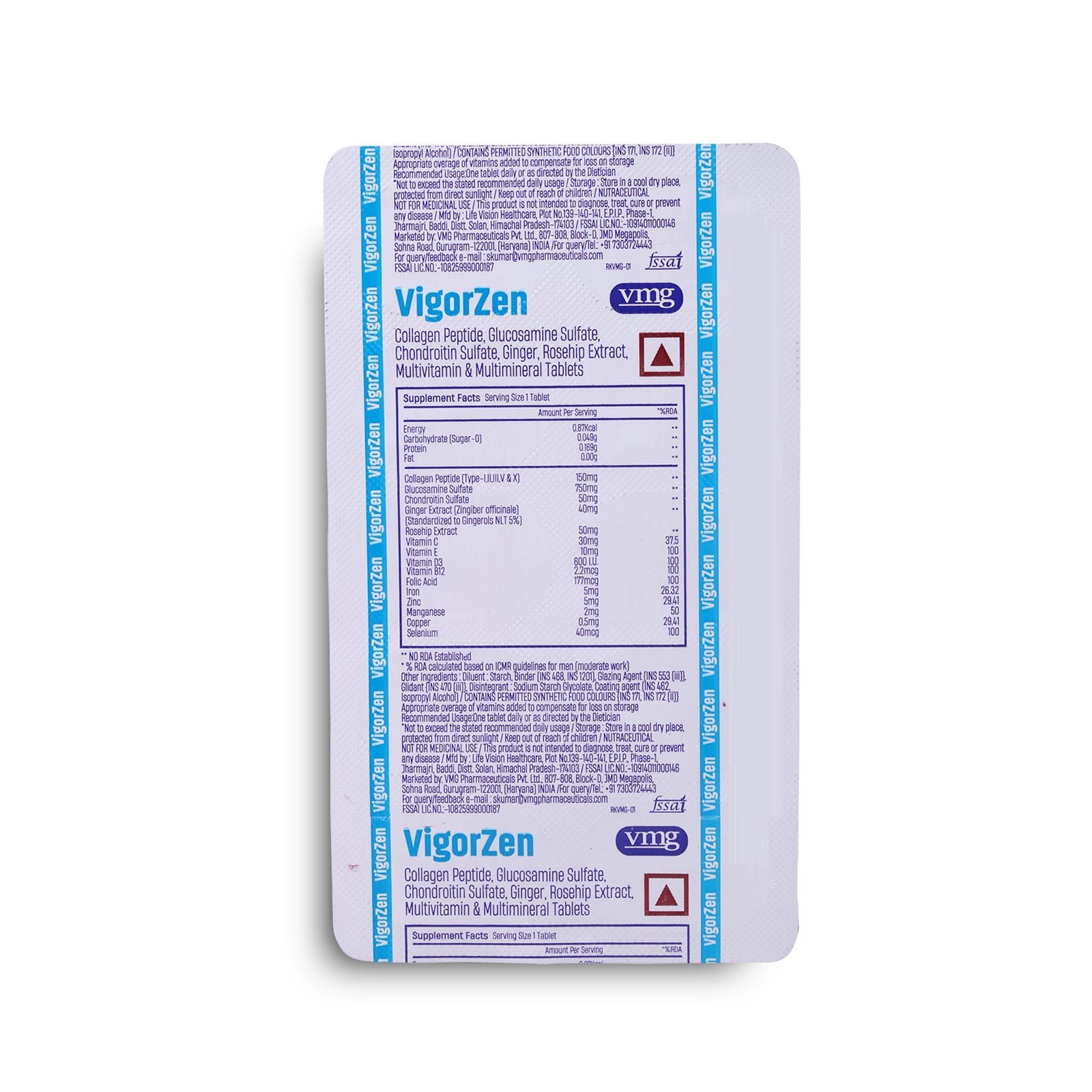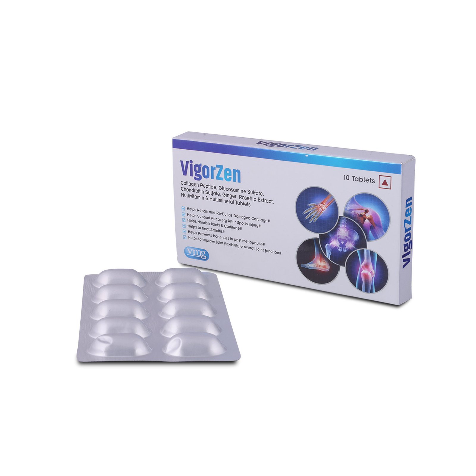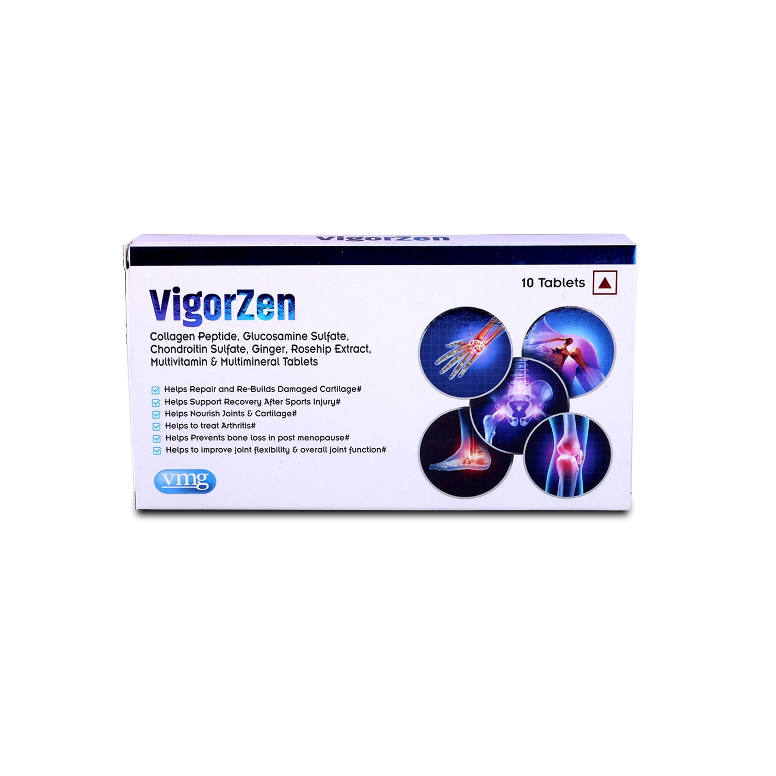 Vmg Vigorzan Joint Pain Relief Tablets is a combination of various compositions like Glucosamine, Collagen Peptide, Rosehip Extract, Ginger Extract, Boswellia Serrata Extract, Chondroitin Sulfate, Vitamin C, and Multivitamins. Rosehip is an herb that contains certain natural substances (polyphenols) that ease joint inflammation and prevent joint damage. Collagen Peptide is a proteoglycan synthesis stimulator that works by building cartilage to repair the joints. Sodium Hyaluronate is the salt form of hyaluronic acid and helps to reduce the friction in the joints. vitamin C is a vitamin that helps in the formation of collagen fibers.
